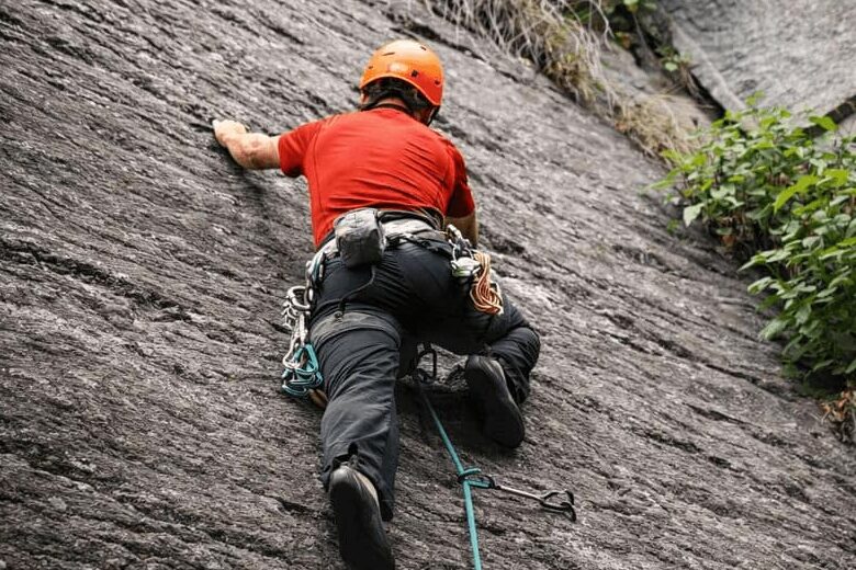 Use of technical climbing equipment (helmet, harness, ropes, carabiners, belay devices)