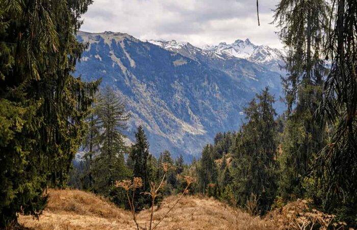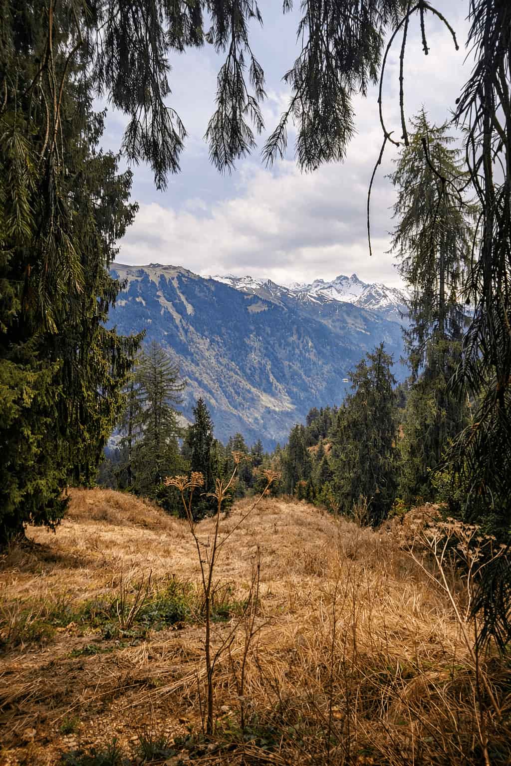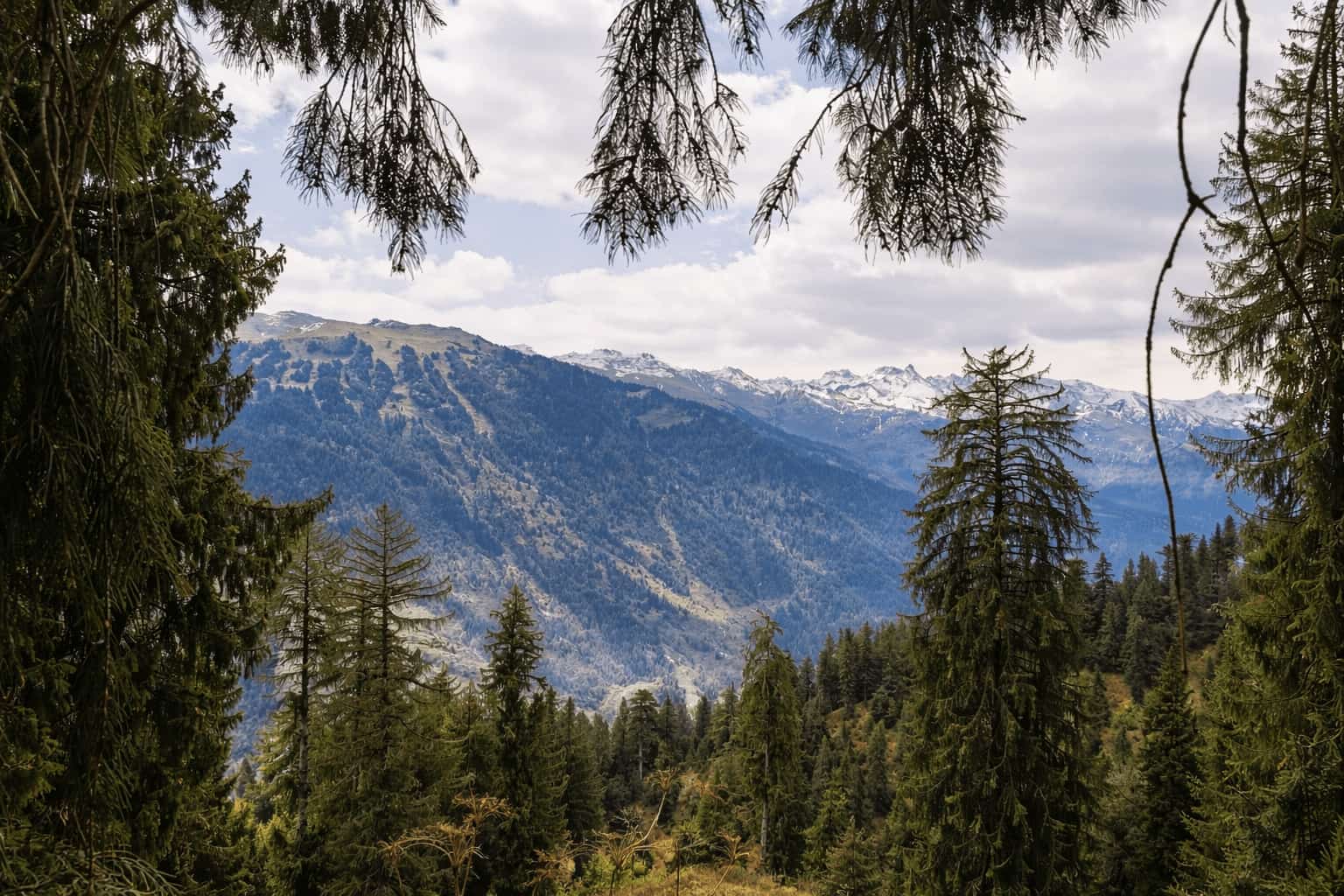 The trail continues uphill at a comfortable pace with regular breaks. Views of the Beas Valley open up below as the forest thins. After around three hours, the tree line ends and wide alpine meadows appear, marking the Panduropa region.