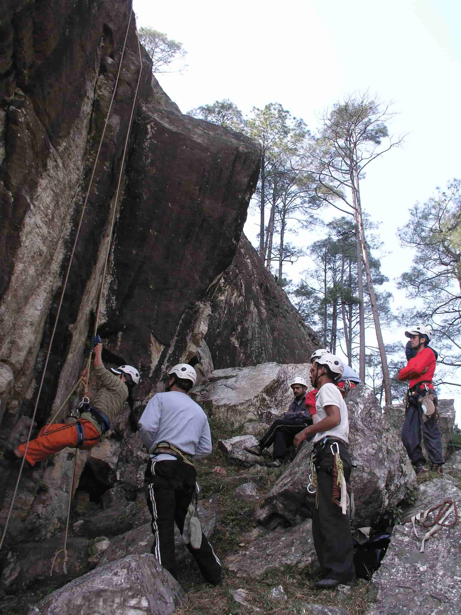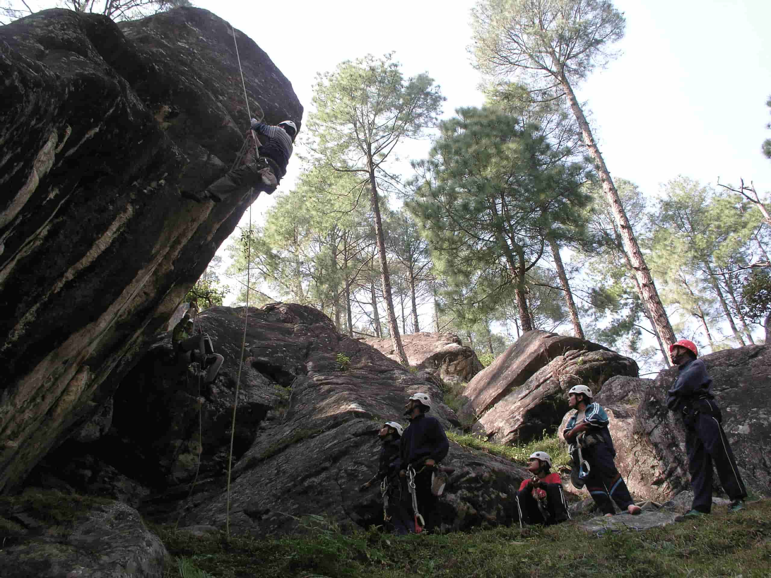 A refreshing morning run and strength training session help build stamina for technical climbing. After breakfast, the pre-lunch module focuses on basic rock climbing techniques, including footwork precision, weight transfer, grip variations, and balance. Trainees climb small natural rock faces to understand movement flow. Post-lunch activities include knot revision and a detailed lecture on climbing safety, belay systems, and communication commands. The evening knot-practice reinforces belay knots, figure-eight, and stopper knots, ensuring that every participant becomes comfortable with essential rope handling.