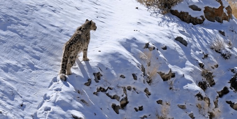 Snow leopard standing on a snowy Himalayan ridge in bright winter sunlight.